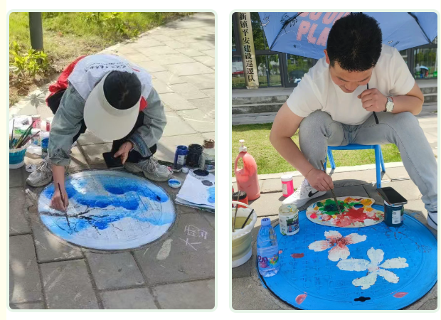 活现场志愿者们认真摆弄手上的调色盘,勾勒线条,细心填充色彩,用一支笔、一双手认真绘出心中所想。在一双双巧手之下,一个个井盖之上绘出一幅幅意境悠远的节气图,将艺术与生活紧密相连,构建了一道靓丽风景线。
