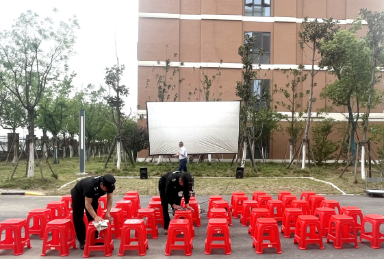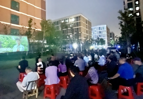 物业中心工作人员在青年公寓中央广场提前布置会场,调试高清数字放映设备,保证放映质量和观影效果。19点30分,经典乡村故事片《金凤湾的笑声》正式开始放映。随着电影开场,广场逐渐坐满观众,晚风轻拂中不时传来会心的笑声。业主李女士表示“这种露天影院让我想起小时候的观影场景,特别有社区温度。”