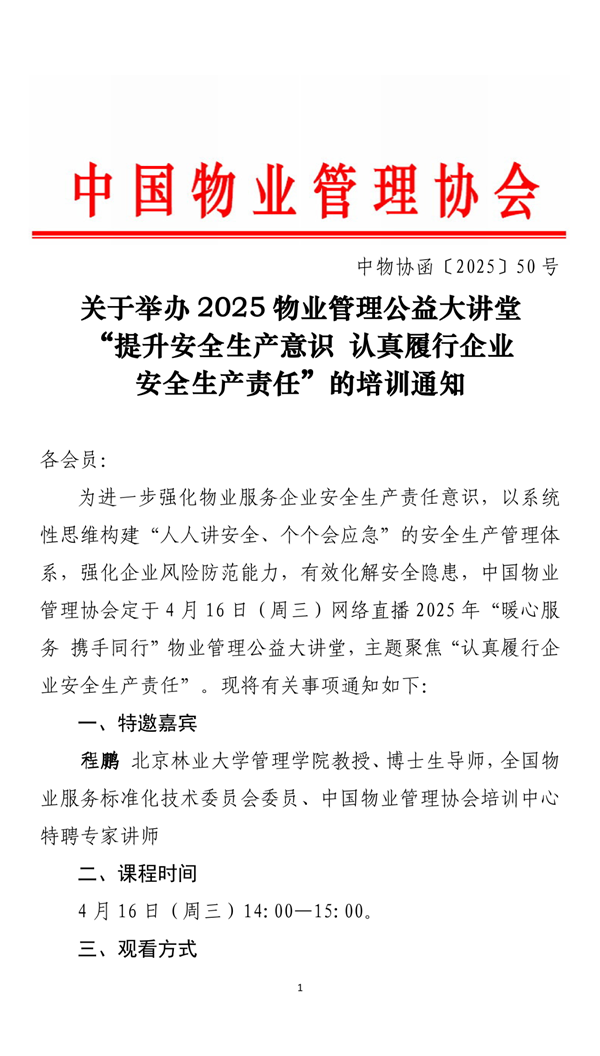 关于举办2025物业管理公益大讲堂“提升安全生产意识 认真履行企业安全生产责任”的培训通知