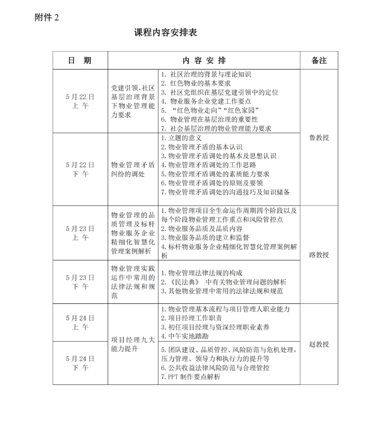 培训课程围绕物业管理实践运作中常用的法规和规范。党建引领,红色物业建设、社区基层治理背景下物业管理能力要求、物业管理矛盾纠纷调处、物业管理全生命运作周期四个阶段以及每个阶段物业管理重点和风险管控点、物业管理的品质及标杆物业服务企业精细化智慧化管理案例分析、项目经理九大能力提升、分组沙盘研讨。