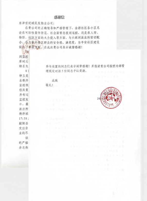3月6日下午,六两河派出所民警为东津世纪城民发物业服务中心送来了感谢信,对此次事件处理的方式和结果予以肯定,并对参与协助调查此次事件的小区经理钟玉美、队长朱斌荣、监控员马燕、客服班长马红兵,秩序班长段耀礼、物管员余志燕等人给予了高度赞扬。