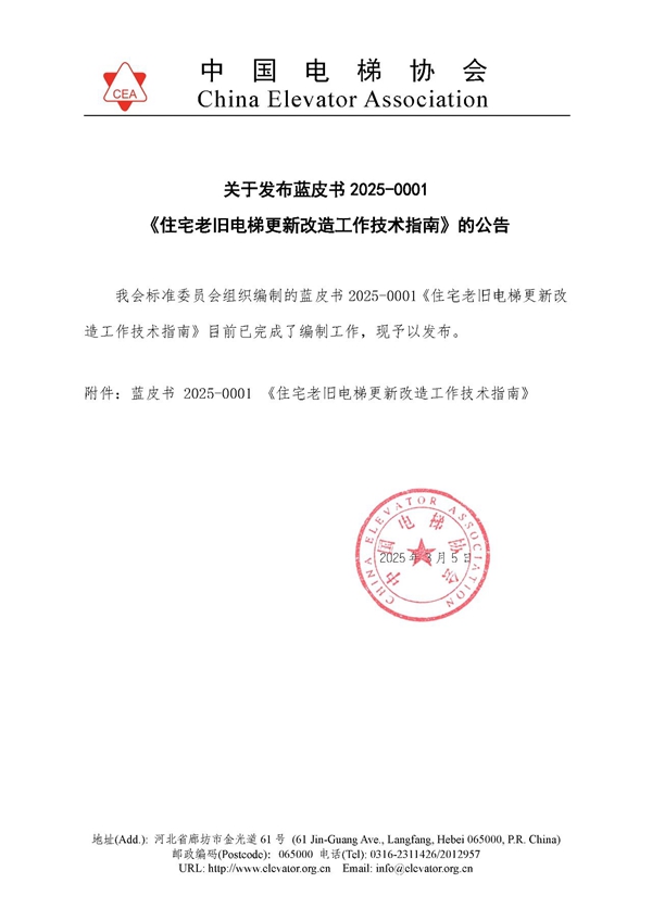 中国电梯协会关于发布蓝皮书《住宅老旧电梯更新改造工作技术指南》的公告