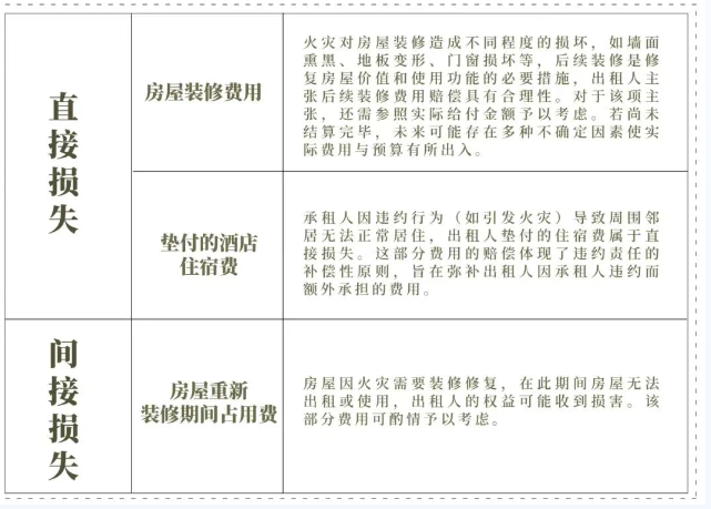 针对崔先生主张的各项损失赔偿与违约金,法院认为,房屋装修费用,属于后续房屋修复的必要支出,有一定的合理性。为邻居垫付的酒店住宿费,是崔先生因邱先生的违约行为而遭受的额外损失,且崔先生提供了相关费用凭证加以佐证,亦有合理性。房屋装修期间的占用费,房屋在火灾后需要重新装修,装修期间的占用确实导致了崔先生的租金收益减少,且该损失与邱先生的违约行为有关,因此该主张也属合理。对于违约金,在双方签订的《房屋租赁合同》中,对违约金有明确的约定,因此法院会根据合同的条款、违约行为的严重程度、双方的实际损失等因素综合判断违约金的合理金额。