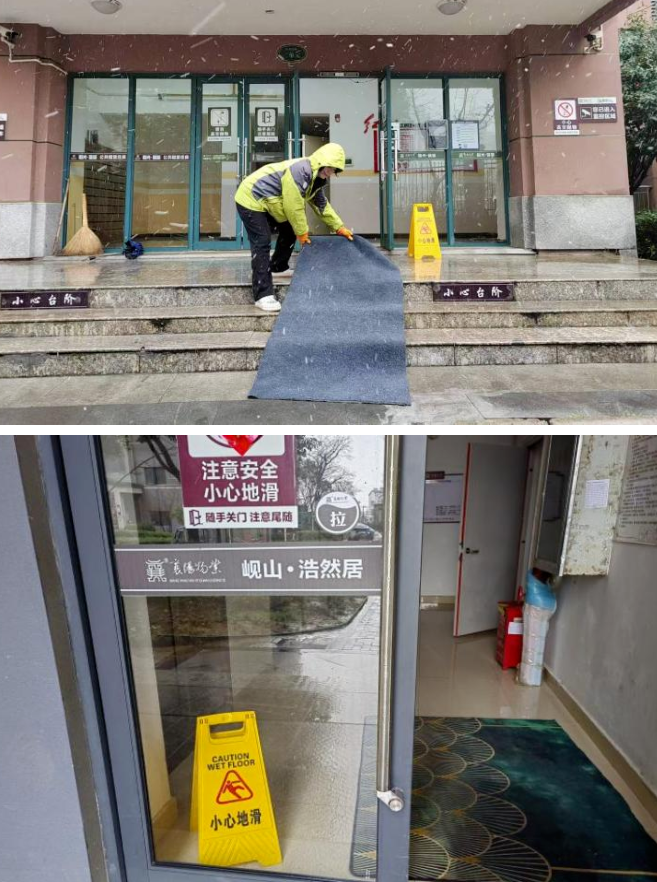 小区“红管家”密切关注天气变化,第一时间通过微信朋友圈推送天气预警信息及出行提示,提醒广大租户做好自身防护;对门栋出入口、无障碍通道等易滑区域,采取铺设防滑垫、设置“小心地滑”警示牌等方式,降低出行隐患;同时增加巡查频次,对易积雪、易结冰路段重点关注,及时清扫路面积水,保障排水畅通。