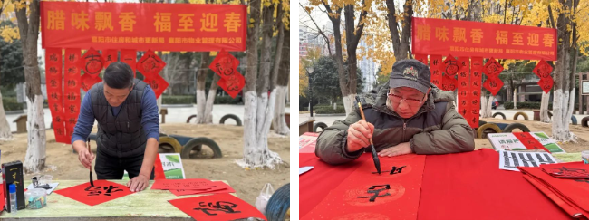 活动伊始,“腊八腊味知识问答”率先登场,主持人抛出“腊味最早起源于何时何地?”等问题,居民们纷纷抢答,气氛热烈,在问答中深入了解腊八节文化;紧接着,书法爱好者们挥毫泼墨,书写“腊鼓催春迎瑞气,福门纳祥启新程”等春联,笔法刚劲、墨香四溢,居民们围赏赞叹,挑选心仪春联把新春祝福带回家;活动最后,物业工作人员将腊八粥分装在事先准备好的容器中,供居民品尝,这一碗碗腊八粥不仅温暖了居民们的胃,更拉近了彼此的心。