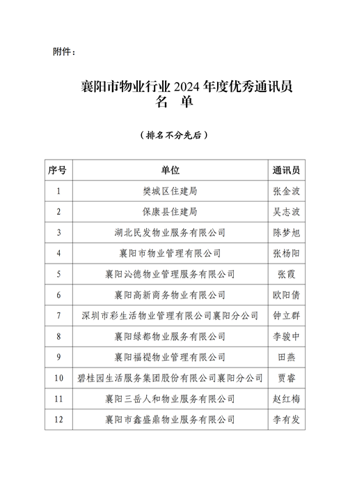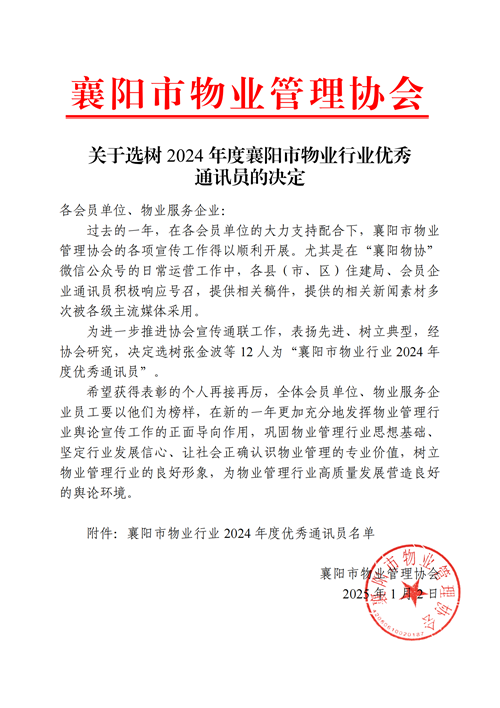 关于选树2024年度襄阳市物业行业优秀通讯员的决定
