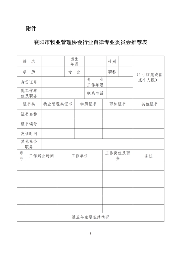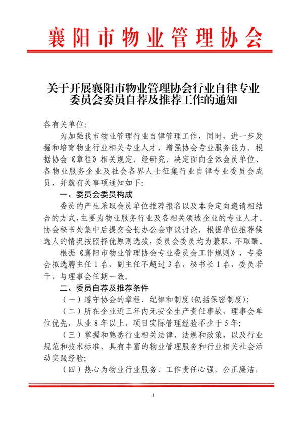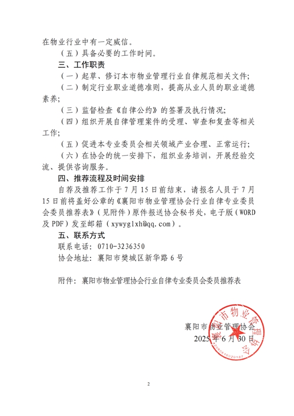 自荐及推荐工作于7月15日前结束,请报名人员于7月15日前将盖好公章的《襄阳市物业管理协会行业自律专业委员会委员推荐表》(见附件)原件报送协会秘书处,电子版(WORD及PDF)发至邮箱(xywyglxh@qq.com)。
