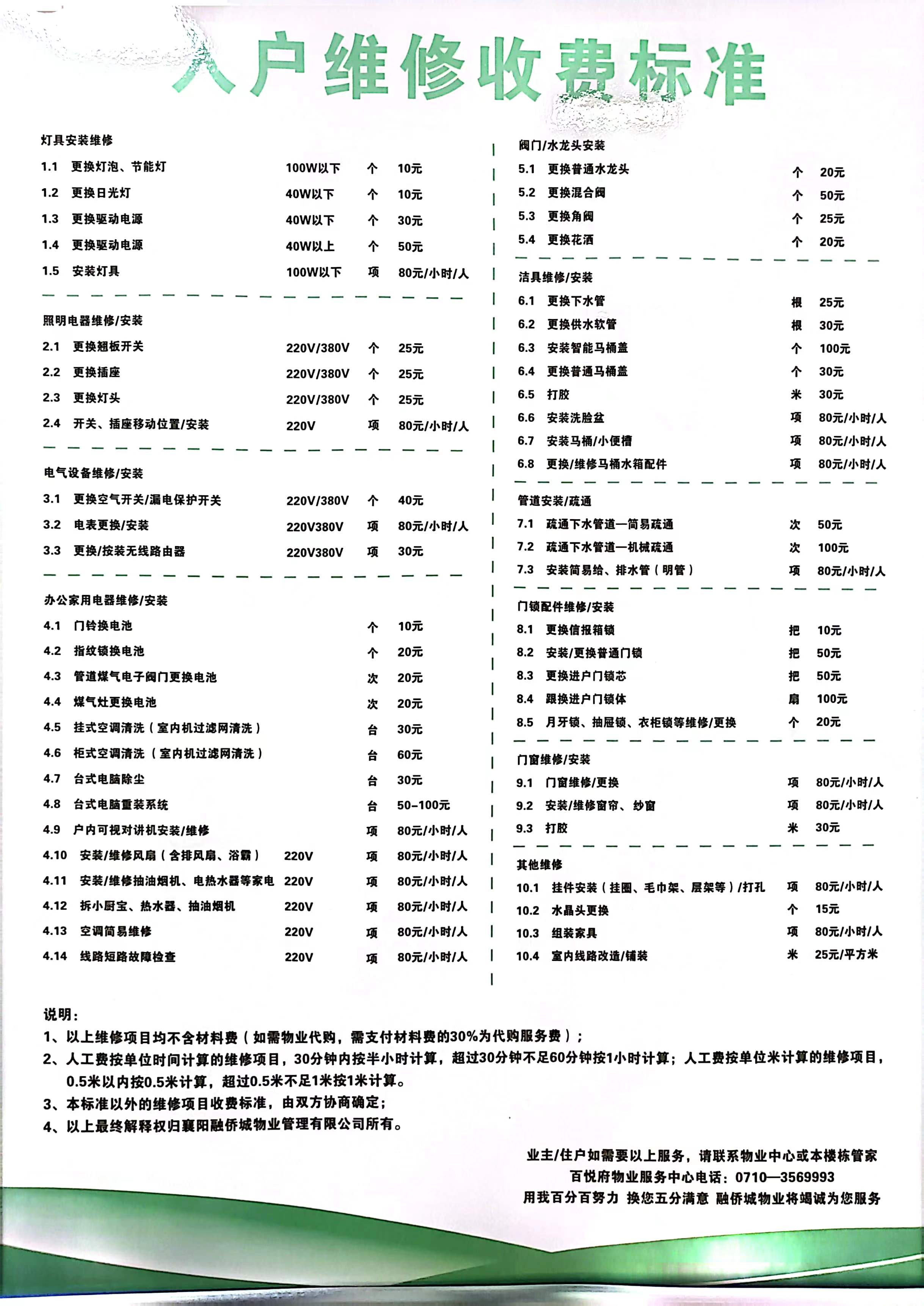 物业有偿服务收费公示包含入户灯具安装维修、阀门/水龙头的安装、门窗维修/安装等