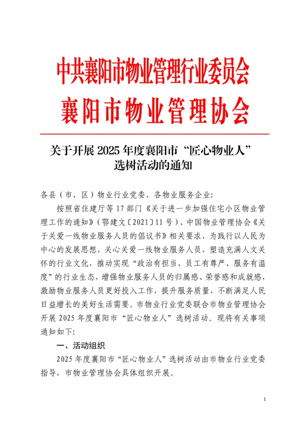 按照省住建厅等17部门《关于进一步加强住宅小区物业管理工作的通知》(鄂建文〔2021〕11号)、中国物业管理协会《关于关爱一线物业服务人员的倡议书》相关要求,为践行以人民为中心的发展思想,关心关爱一线物业服务人员,塑造充满人文关怀的行业文化,推动实现“政治有担当、员工有尊严、服务有温度”的行业生态,增强物业服务人员的归属感、荣誉感和成就感,激励物业服务人员更好投入工作,提升服务质量,不断满足人民日益增长的美好生活需要。市物业行业党委联合市物业管理协会开展2025年度襄阳市“ 匠心物业人”选树活动。现将有关事项通知如下: