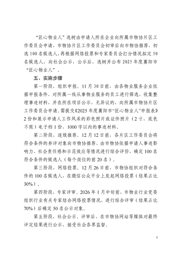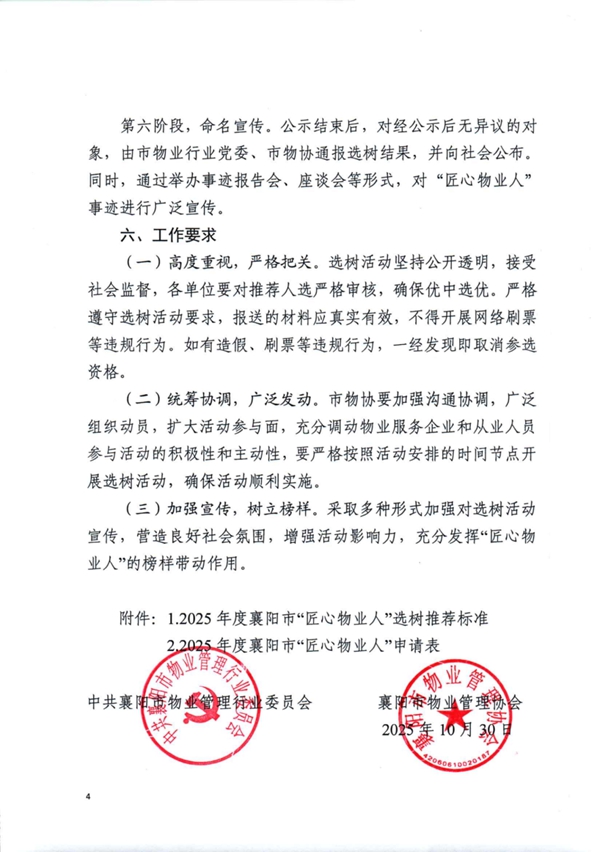 2025年度襄阳市“匠心物业人”选树活动由市物业行业党委指导,市物业管理协会具体组织开展。