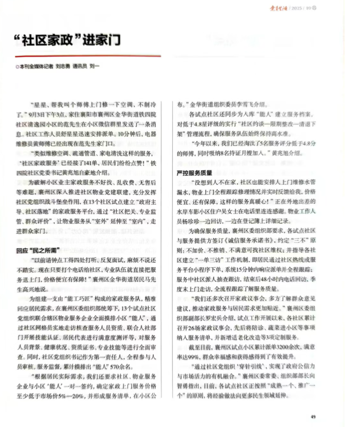 为破解小区业主家政服务不好找、乱收费、无售后等难题,襄州区深入推进社区物业党建联建,充分发挥社区党组织战斗堡垒作用,在13个社区试点建立“政府主导、社区落地”的家政服务平台,通过“社区把关、专业监管、群众评价”,让物业服务从“室外”延伸至“室内”,走进群众家门。