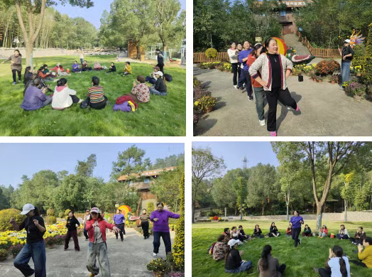 午餐后,是自由活动与休闲娱乐时间。景区的开阔草坪和幽静的定情谷里,处处洋溢着欢声笑语。大家围成圈玩着趣味游戏,随着音乐翩翩起舞,在如画风景中留下美好瞬间。每个人都沉浸在欢乐的氛围里,玩得格外尽兴。