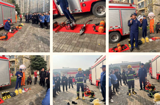 消防员先带大家认识多种消防专业工具:消防无齿锯、机动泵、液压扩张器、正压式空气呼吸器等;再重点讲解小区微型消防站里各类设施的使用方法,现场指导秩序工作人员实操穿戴消防战斗服、空气呼吸器面罩等装备,从服装的快速穿戴步骤到面罩的密封检查要点逐一演示,让大家直观掌握个人防护装备的正确使用方式,切实筑牢安全防护的第一道屏障。