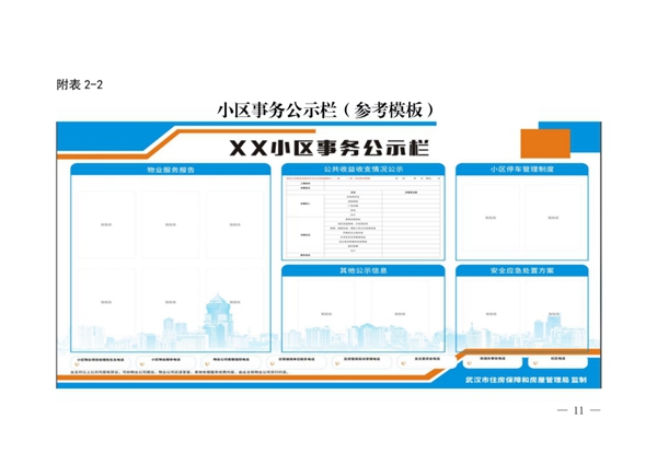 在小区原有“ 三栏一箱”(物业服务基本信息公示栏、小区事务公示栏、政策法规宣传栏、物业服务意见收集箱)的基础上,鼓励有条件的物业服务企业完善设立物业服务事务查询台,设置在物业管理区域的客户接待场所(客户服务中心),采取文件筐、文件柜等形式,分类存放相关公开公示资料文件,免费供业主查询。鼓励有条件的小区采用电视、电子显示屏等形式滚动 播放或自助查询有关资料文件。同时,各项服务公开公示资料也可通过业主微信群、物业企业的物业服务信息平台、住建部门的物业服务监管平台等渠道开展线上公示,确保业主及时了解动态。物业服务意见收集箱至少每周开启一次,及时答复业主提出的意见建议。