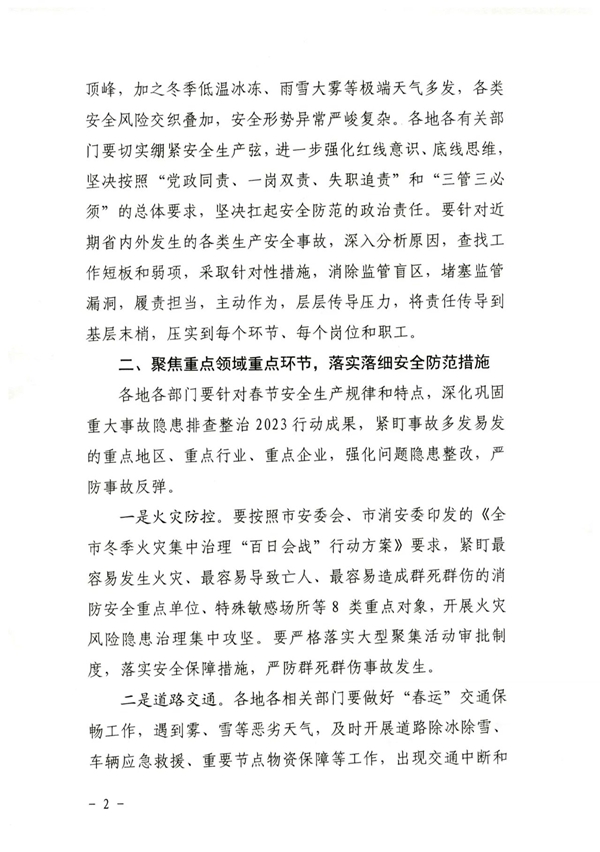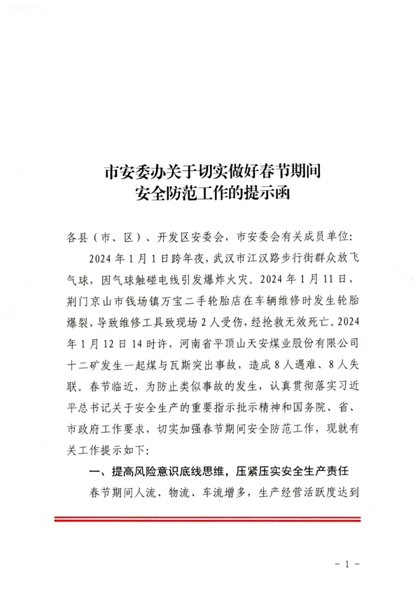 市安委办关于切实做好春节期间安全防范工作的提示函